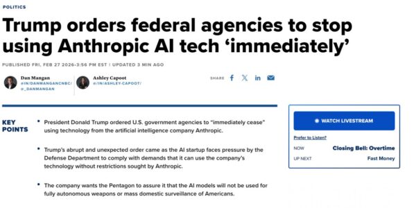 President Donald Trump announced on Friday, February 27, 2026, that the entirety of the U.S. federal government will cease its use of artificial intelligence (AI) technology provided by Anthropic. The decision follows protracted negotiations between the Department of War and…